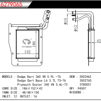 适用于GM DODGE Dodge Dart 360 V8 5.9L -76 Dodge Dart Base L6 3.7L 73-76 Plymouth Duster 340 V8 5.6L-73 暖风