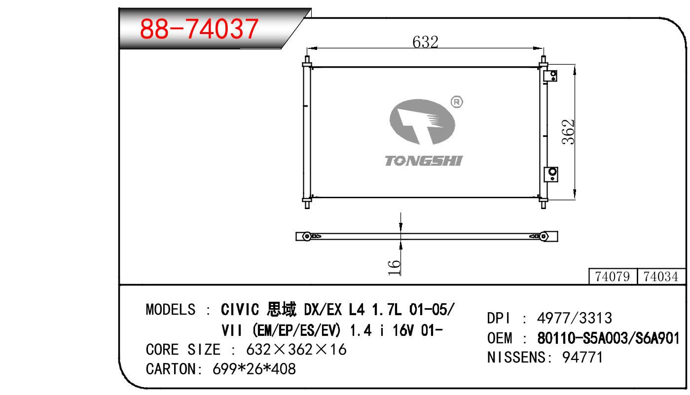适用于本田思域 DX/EX L4 1.7L 01-05/VII(EM/EP/EV) 1.4I 16V 01- 冷凝器 OEM:80110-S5A003/80110-S6A901