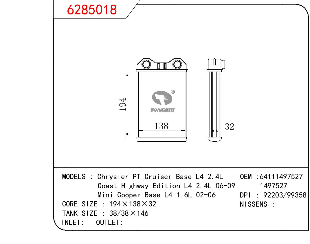 适用于宝马 Chrysler PT Cruiser Base L4 2.4L/Coast Highway Edition L4 2.4L 06-09/迷你 Cooper Base L4 1.6L 02-06 暖风 OEM:64111497527/1497527