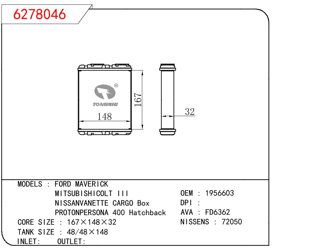 适用于福特 MAVERICK /三菱COLT III/ 日产VANETTE CARGO BOX /PROTONPERSONA 400 HATCHBACK 暖风 OEM:1956603