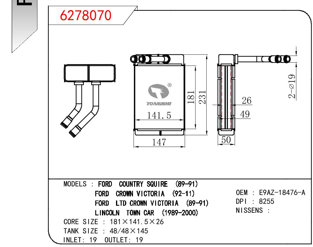 适用于福特COUNTRY SQUIRE 89-91/福特CROWN VICTORIA 89-91/林肯TOWN CAR 89-00暖风 OEM : E9AZ-18476-A