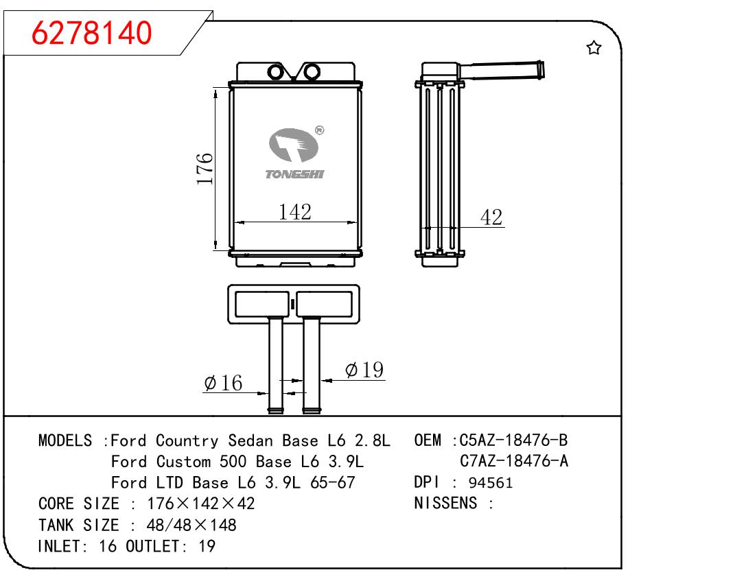 适用于FORD Ford Country Sedan Base L6 2.8L/Ford Custom 500 Base L6 3.9L/Ford LTD Base L6 3.9L 65-67 OEM:C5AZ-18476-B/C7AZ-18476-A