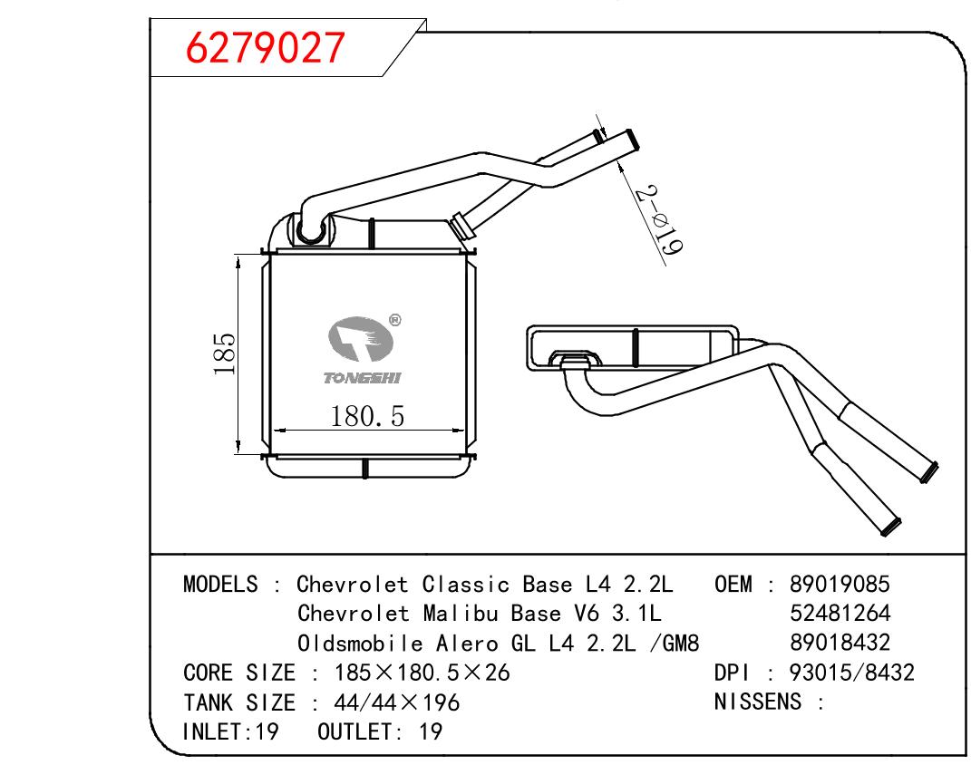 适用于GM DODGE Chevrolet Classic Base L4 2.2L/Chevrolet Malibu Base V6 3.1L/Oldsmobile Alero GL L4 2.2L /GM8 OEM:89019085/52481264/89018432