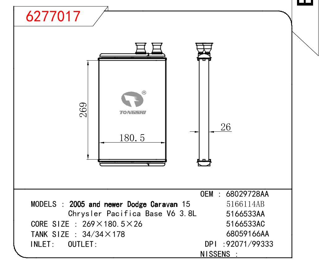 适用于2005 AND NEWER DODGE CARAVAN 15 Chrysler Pacifica Base V6 3.8L暖风 OEM : 68029728AA/5166114AB