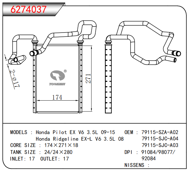 适用于本田 Pilot EX V6 3.5L 09-15 本田 Ridgeline EX-L V6 3.5L 08 暖风