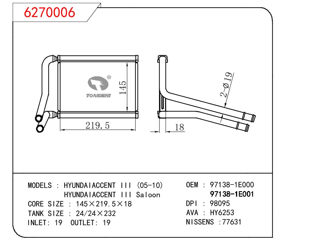 适用于HYUNDAI HYUNDAI ACCENT III 05-10/HYUNDAI ACCENT III SALOON OEM:97138-1E000/971381E000/97138-1E001