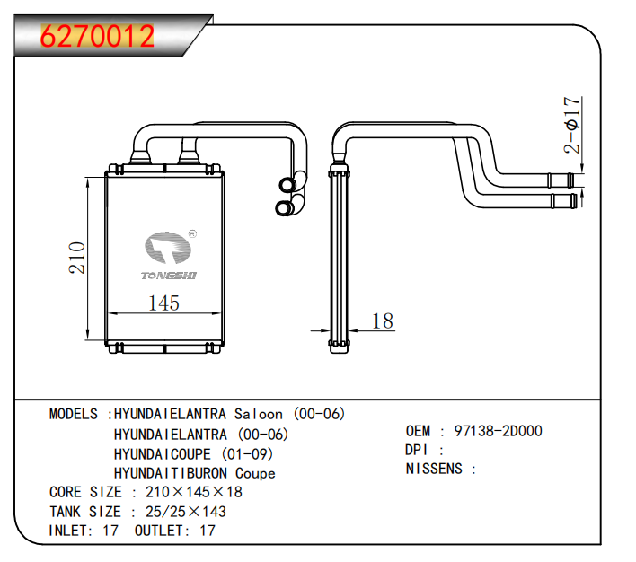适用于现代伊兰特轿车(00-06)/ 现代伊兰特(00-06)/ 现代轿车(01-09)/ 现代蒂伯龙双门轿跑车暖风