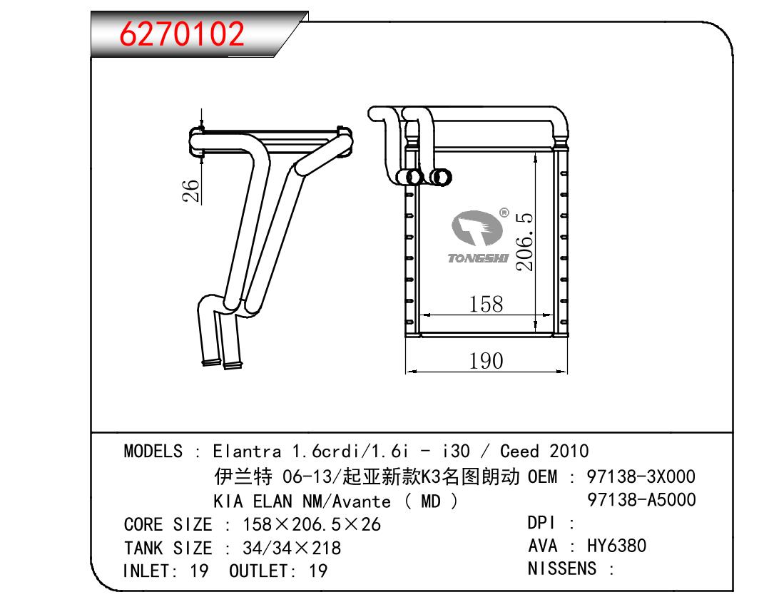 适用于伊兰特 1.6crdi/1.6i - i30 /Ceed 2010/伊兰特 06-13/起亚新款K3名图朗动/起亚ELAN NM/朗动 ( MD )暖风 OEM : 97138-3X000
