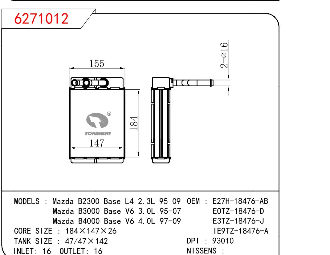 适用于MAZDA Mazda B2300 Base L4 2.3L 95-09/Mazda B3000 Base V6 3.0L 95-07/Mazda B4000 Base V6 4.0L 97-09 OEM:E27H18476AB/EOTE18476D/E3TZ18476J/IE9TZ18476A