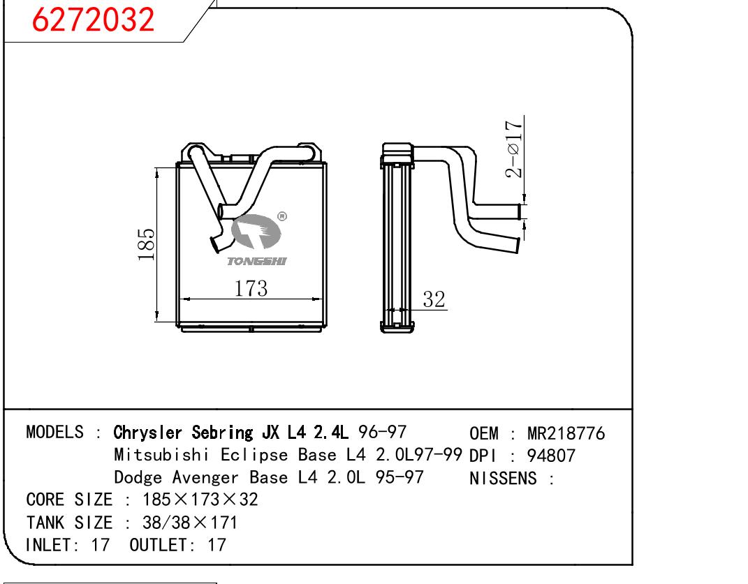 适用于Chrysler Sebring JX L4 2.4L 96-97/三菱伊柯丽斯Base L4 2.0L97-99/道奇锋哲Base L4 2.0L 95-97暖风 OEM : MR218776
