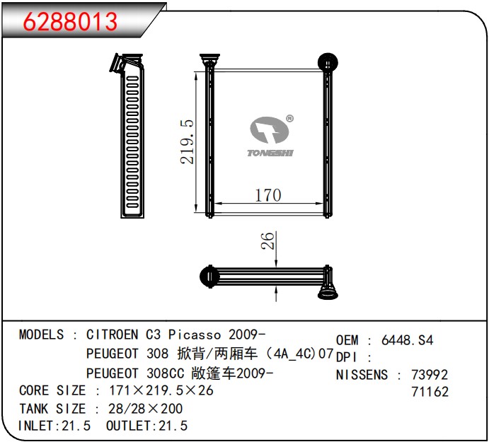 适用于雪铁龙C3 Picasso 2009-/标致 308 掀背/两厢车(4A_4C)07/标致 308CC 敞篷车2009- 暖风