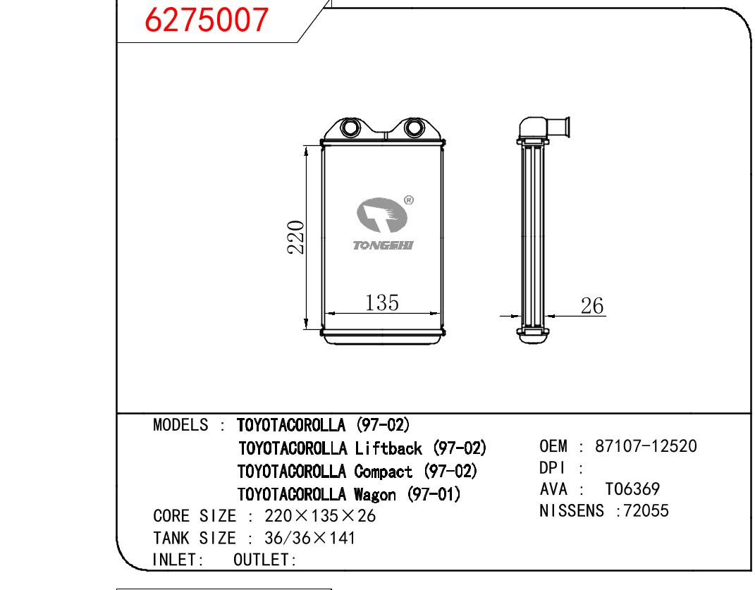 适用于丰田卡罗拉97-02/卡罗拉LIFTBACK 97-02/卡罗拉COMPACT 97-02/卡罗拉WAGON 97-01暖风 OEM : 87107-12520
