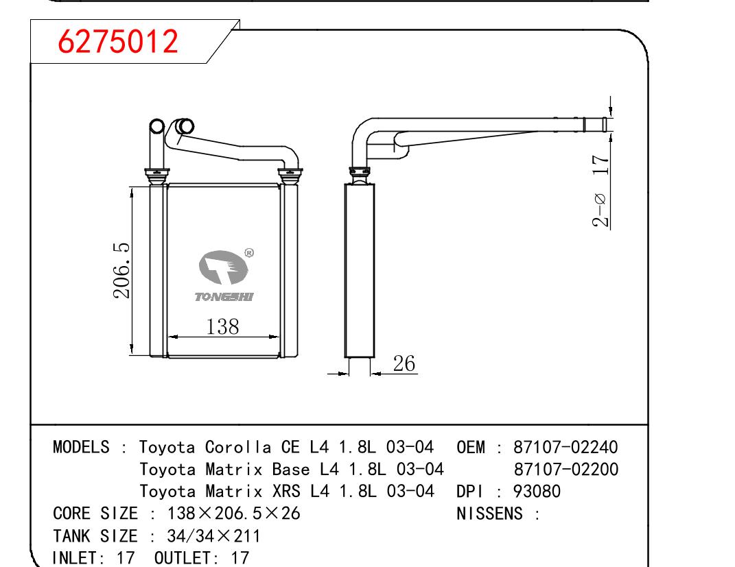适用于丰田卡罗拉CE L4 1.8L 03-04/Matrix Base L4 1.8L 03-04/Matrix XRS L4 1.8L 03-04暖风 OEM :87107-02240/02200