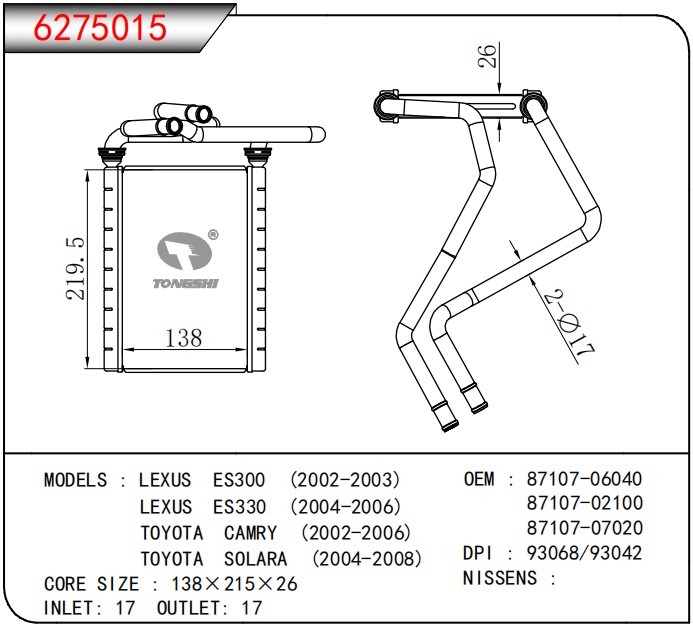 适用于雷克萨斯ES300 (2002-2003) /雷克萨斯ES330 (2004-2006)/丰田凯美瑞(2002-2006)/丰田SOLARA (2004-2008) 暖风
