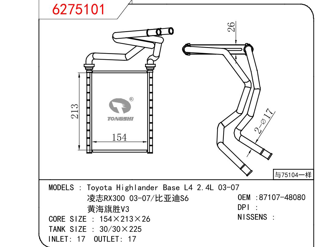 • Toyota Highlander Base L4 2.4L 03-07凌志RX300 03-07/比亚迪S6/黄海旗胜V3