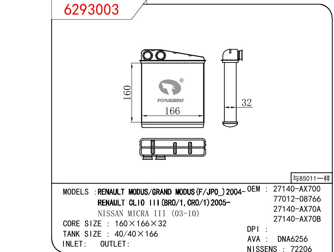 • 芯体尺寸:160*166*32