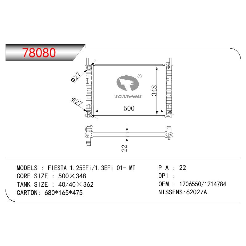 适用于福特嘉年华 1.25EFI/1.3EFI 01- MT散热器 OEM:1206550/1214784