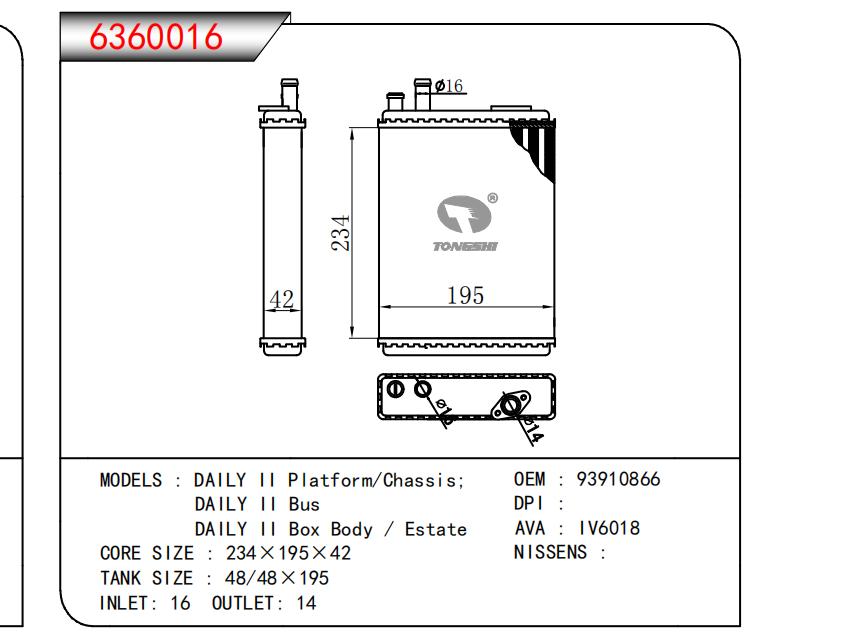 适用于DAILY II Platform/Chassis;DAILY II Bus DAILY II Box Body / Estate OEM:93910866