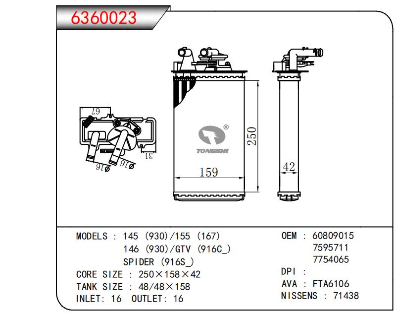适用于145 (930) /155 (167)146 (930)/GTV(916C)SPIDER (916S) OEM:60809015,7595711,7754065