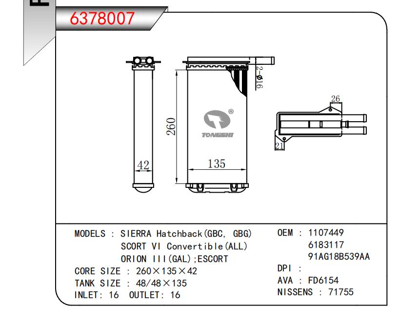 适用于SIERRA Hatchback(GBC,GBG)SCORT VI Convertible(ALL)ORION III(GAL):ESCORT OEM:1107449,6183117,91AG18B539AA