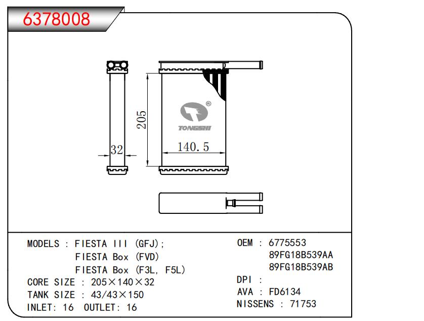 适用于FIESTA III(GFJ);FIESTA Box(FVD)FIESTA Box((F3L,F5L) OEM:6775553,89FG18B539AA,89FG18B539AB