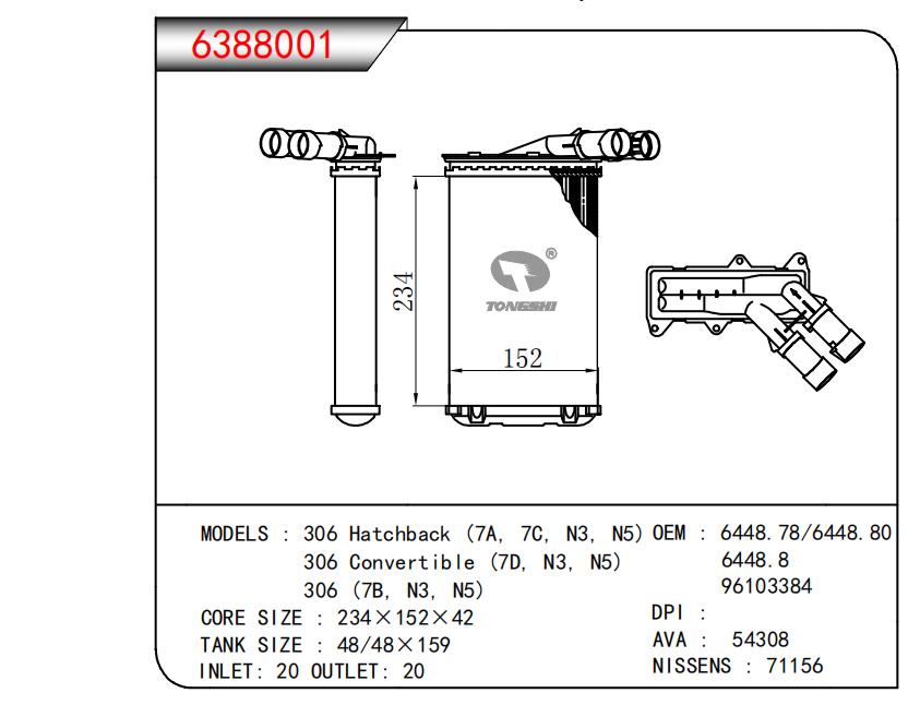 适用于306 Hatchback (7A,7C,N3,N5) 0EM306 Convertible (7D,N3,N5)306 (7B,N3,N5) OEM:6448.78,6448.80,6448.8,96103384