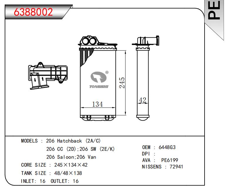 适用于206 Hatchback (2A/C)206 CC (2D);206 SW (2E/K)206 Saloon;206 Van OEM:6448G3